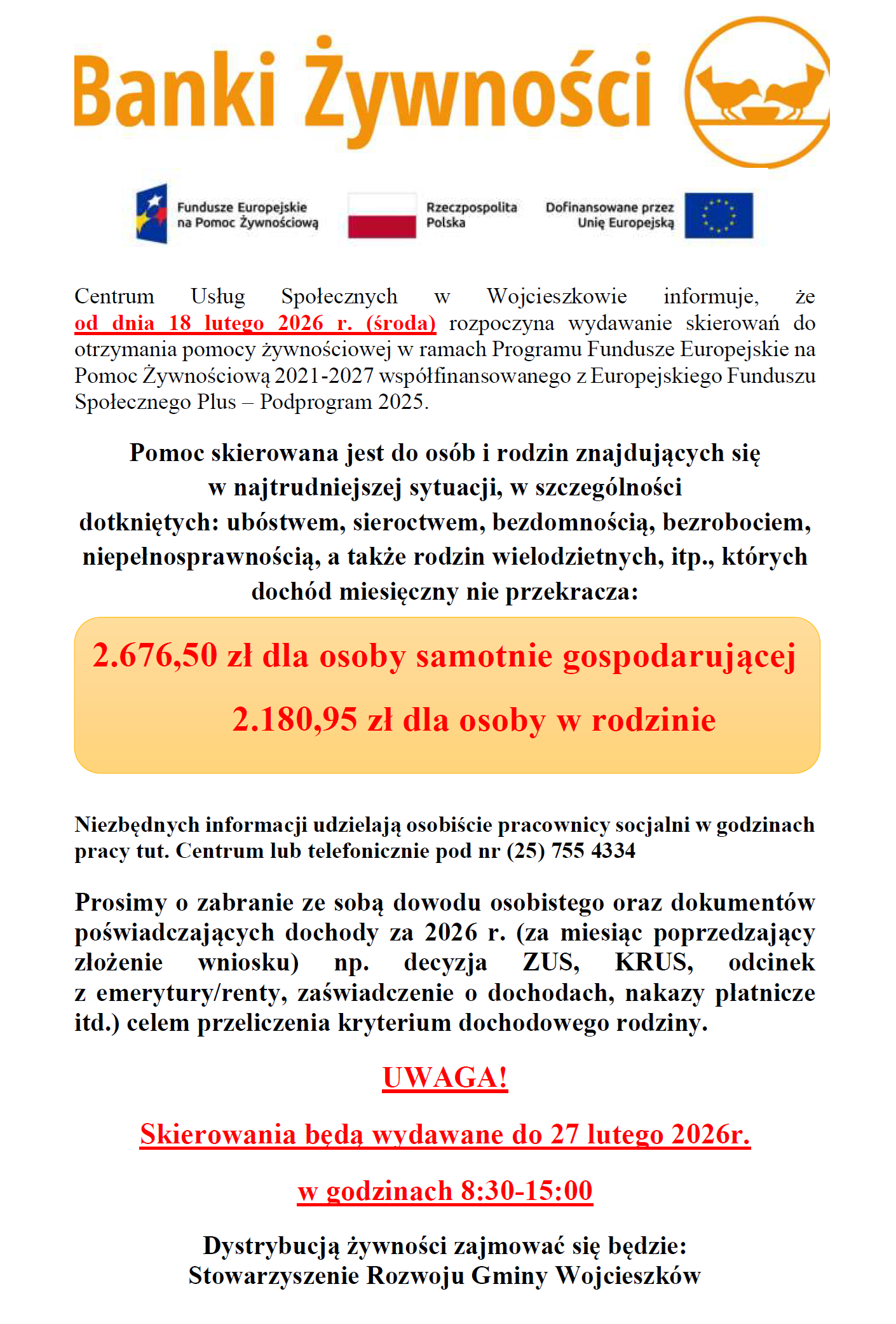Centrum Usług Społecznych w Wojcieszkowie informuje, że od 18 lutego 2026 r. do 27 lutego 2026 r. w godz. 8:30–15:00 będą wydawane skierowania do otrzymania pomocy żywnościowej w ramach Programu FEPŻ 2021–2027.